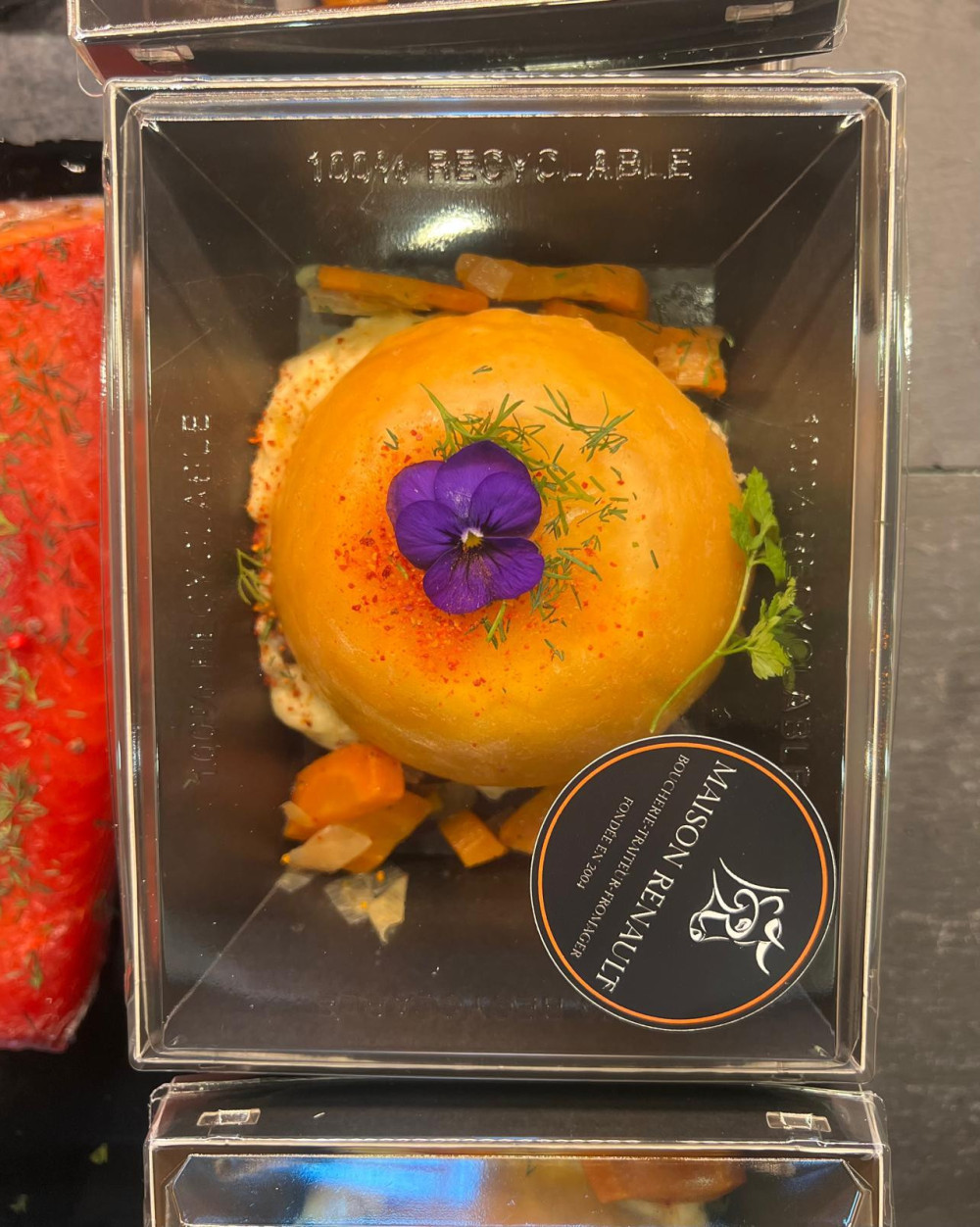 Saumon en dôme farci avec une mousse de poisson, dés de saumon et sa fondue de poireaux parmentière.