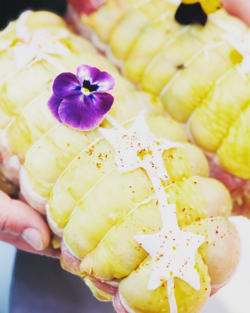 Chapon entièrement désossé, roulé en rôti avec une farce de Noël ( pain d'épices, foie gras, marrons).