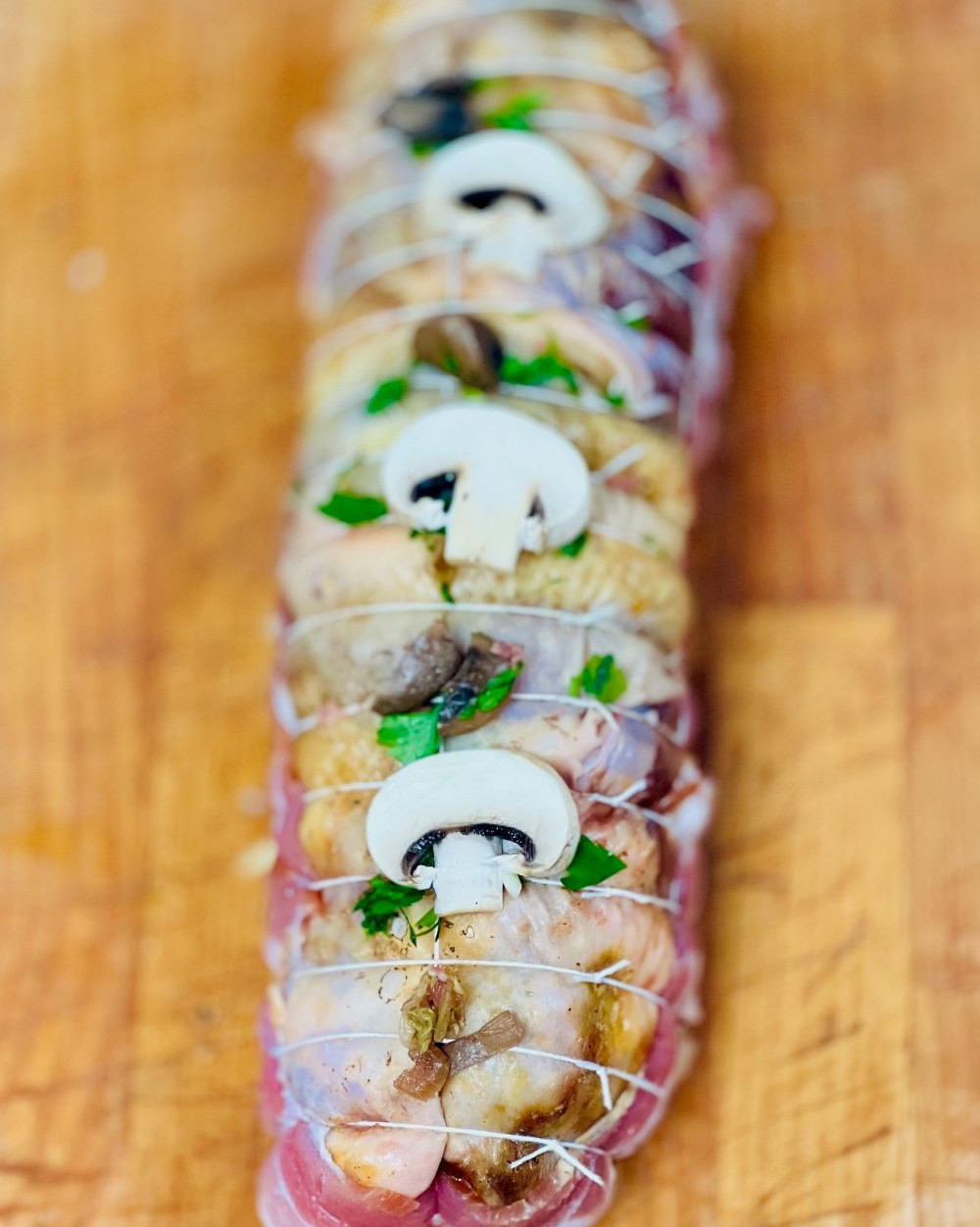 Pintade entièrement désossée roulée avec une farce aux chamignons (morilles, trompettes).Présenté en emballage sous-vide pour faciliter la cuisson au bain-marie et préserver la tendreté et les saveurs lors de la cuisson.